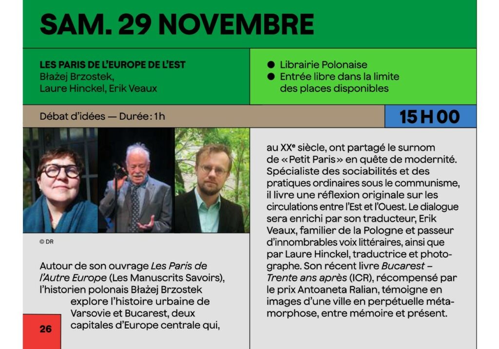 Retrouvez- moi samedi prochain à la Librairie polonaise, sur le boulevard Saint Germain à Paris : je vais avoir le plaisir de débattre avec Blazej Brzostek, un historien polonais qui a consacré un ouvrage à Varsovie et Bucarest.